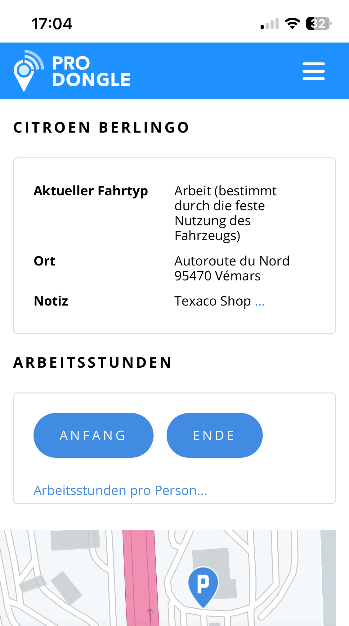 Die 'Fahrer-App' ermöglicht es Mitarbeitern, Beginn und Ende ihrer Arbeitszeit zu verwalten. Diese Informationen werden in den Berichten erfasst und können vom Manager bestätigt oder geändert werden.